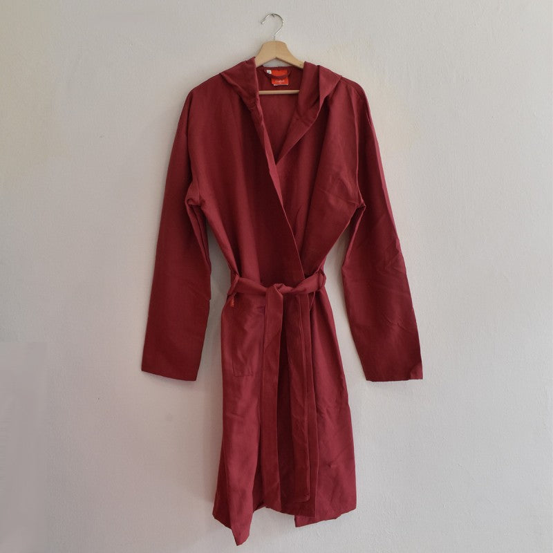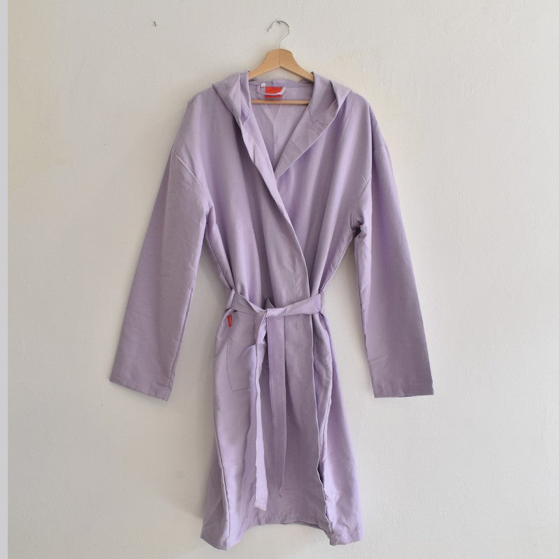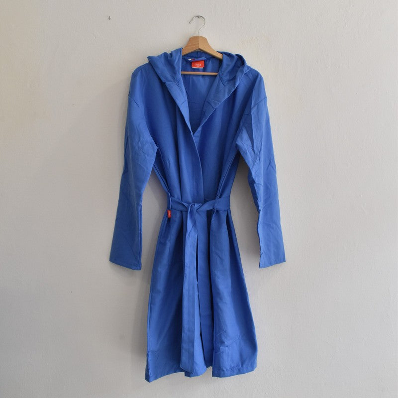 L’accappatoio è dotato di cappuccio, tasche laterali e cintura in vita e viene fornito in una comoda borsa con cerniera, anch’essa in microfibra, che occupa pochissimo spazio nel borsone o in valigia.