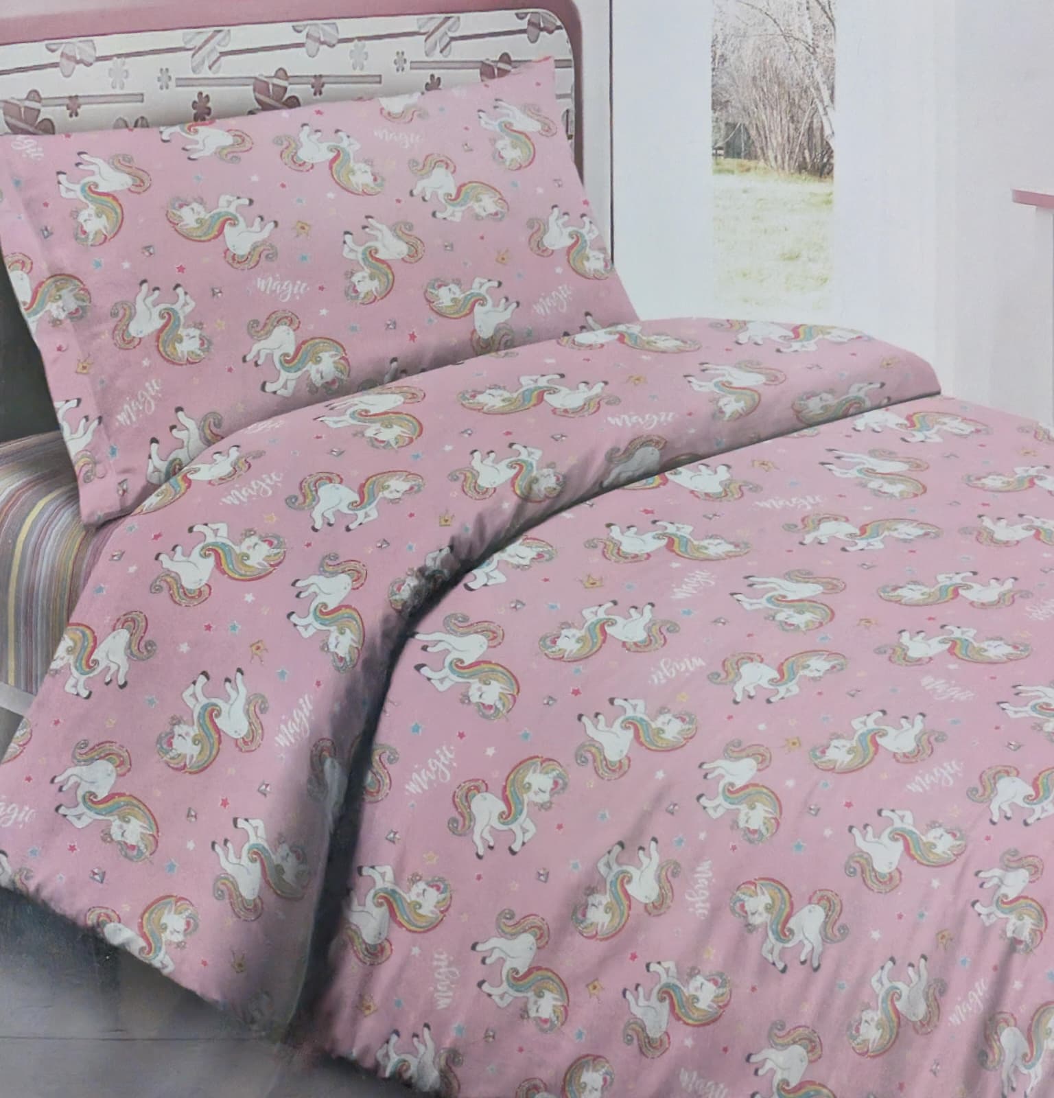 Entra in un mondo di sogni e magia. Il completo lenzuola Unicorno della linea Quadrifoglio trasforma la camera in un regno incantato. Il design presenta dolcissimi unicorni bianchi con criniere arcobaleno, circondati da una pioggia di stelline, cuoricini e scritte colorate. La palette di colori pastello, dominata dal rosa e dal bianco, crea un'atmosfera rassicurante e sognante, perfetta per chi ama lo stile "fairy tale".