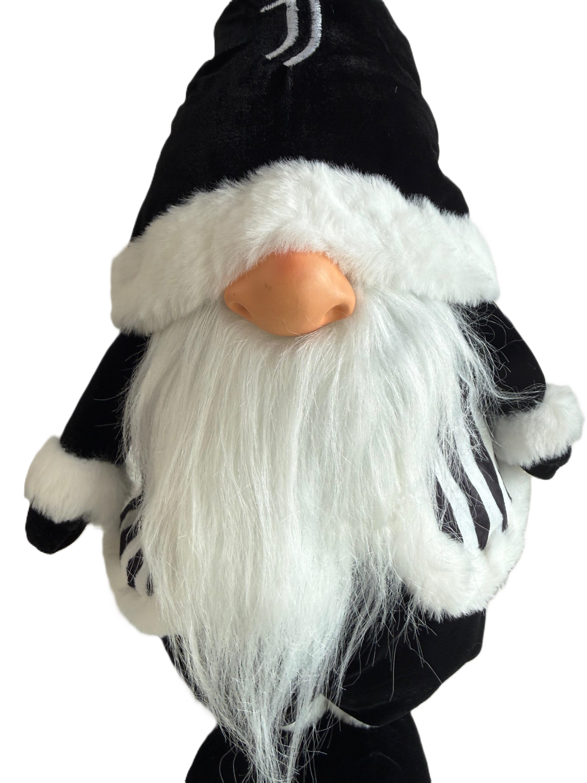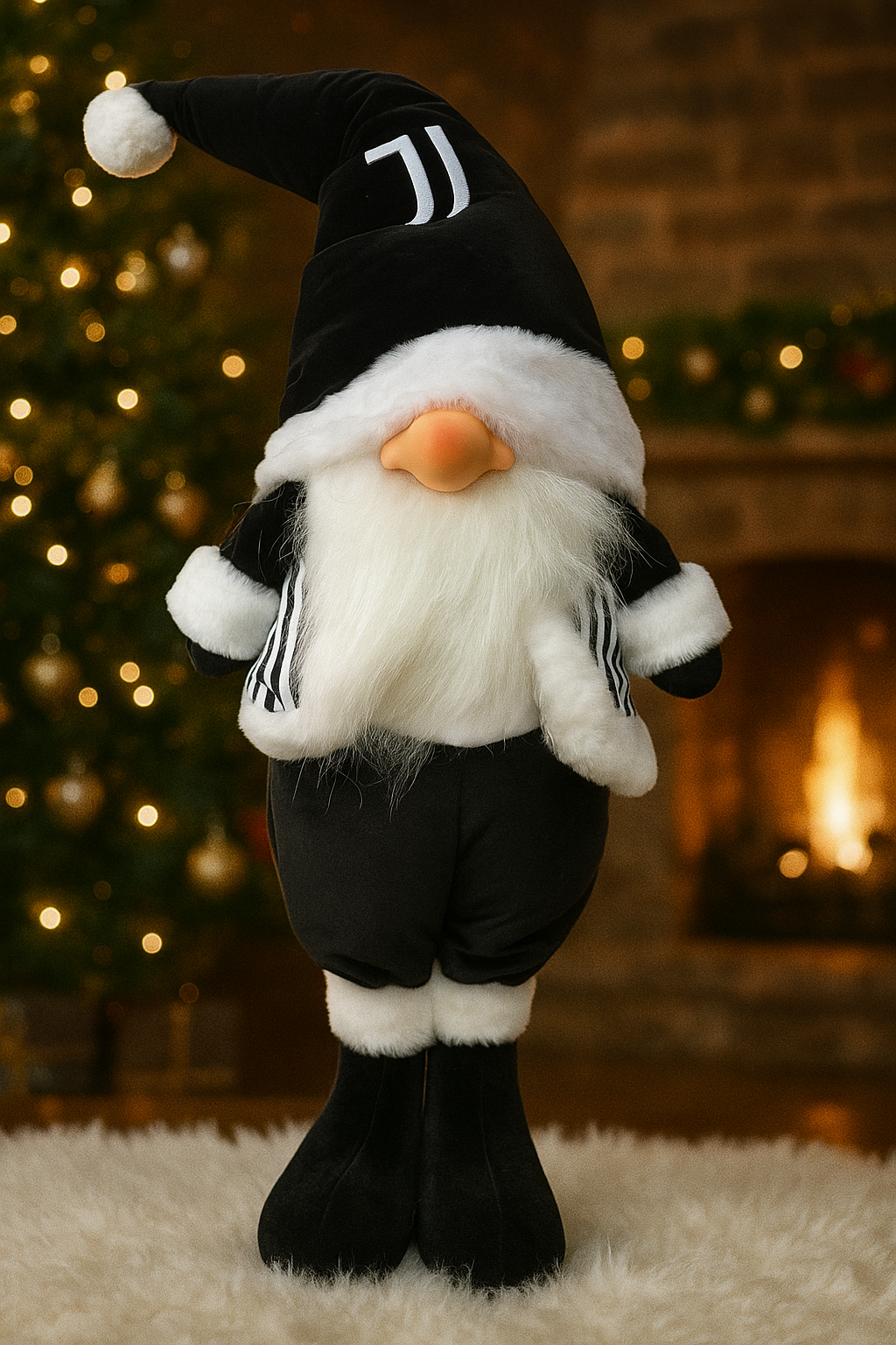Realizzato con materiali morbidi e di alta qualità, lo gnomo indossa un cappello bianco e nero con il logo Juventus, un panciotto a righe bianconere e scarpe coordinate. La lunga barba bianca e i dettagli in pelliccia sintetica completano il suo look festivo e raffinato.