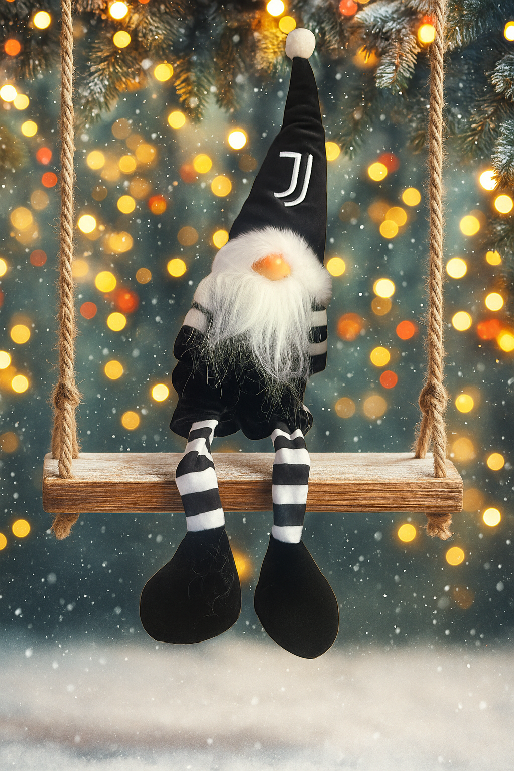 Realizzato con materiali morbidi e di alta qualità, lo gnomo indossa un cappello bianco e nero con il logo Juventus, un panciotto a righe bianconere e scarpe coordinate. La lunga barba bianca e i dettagli in pelliccia sintetica completano il suo look festivo e raffinato.
