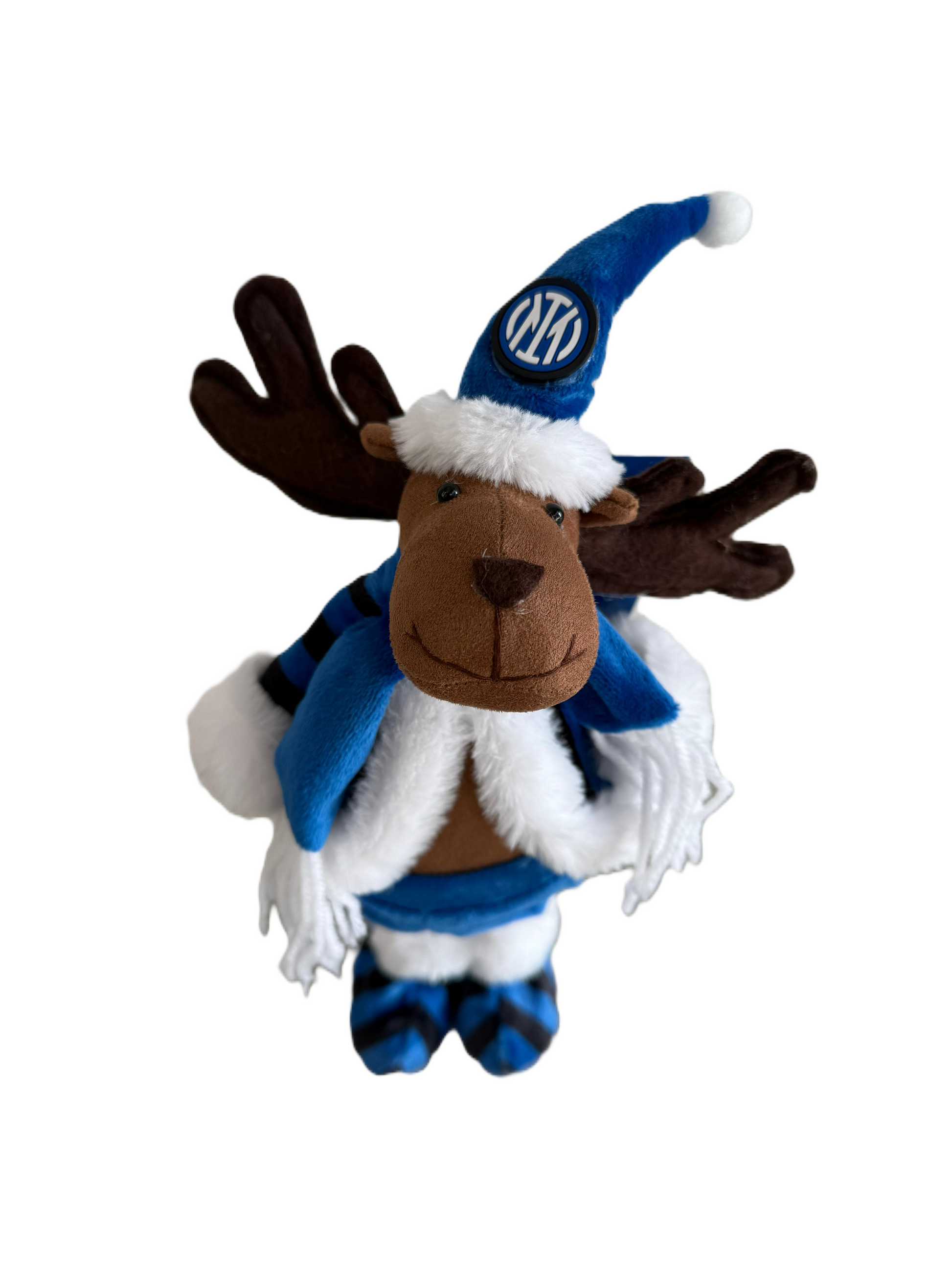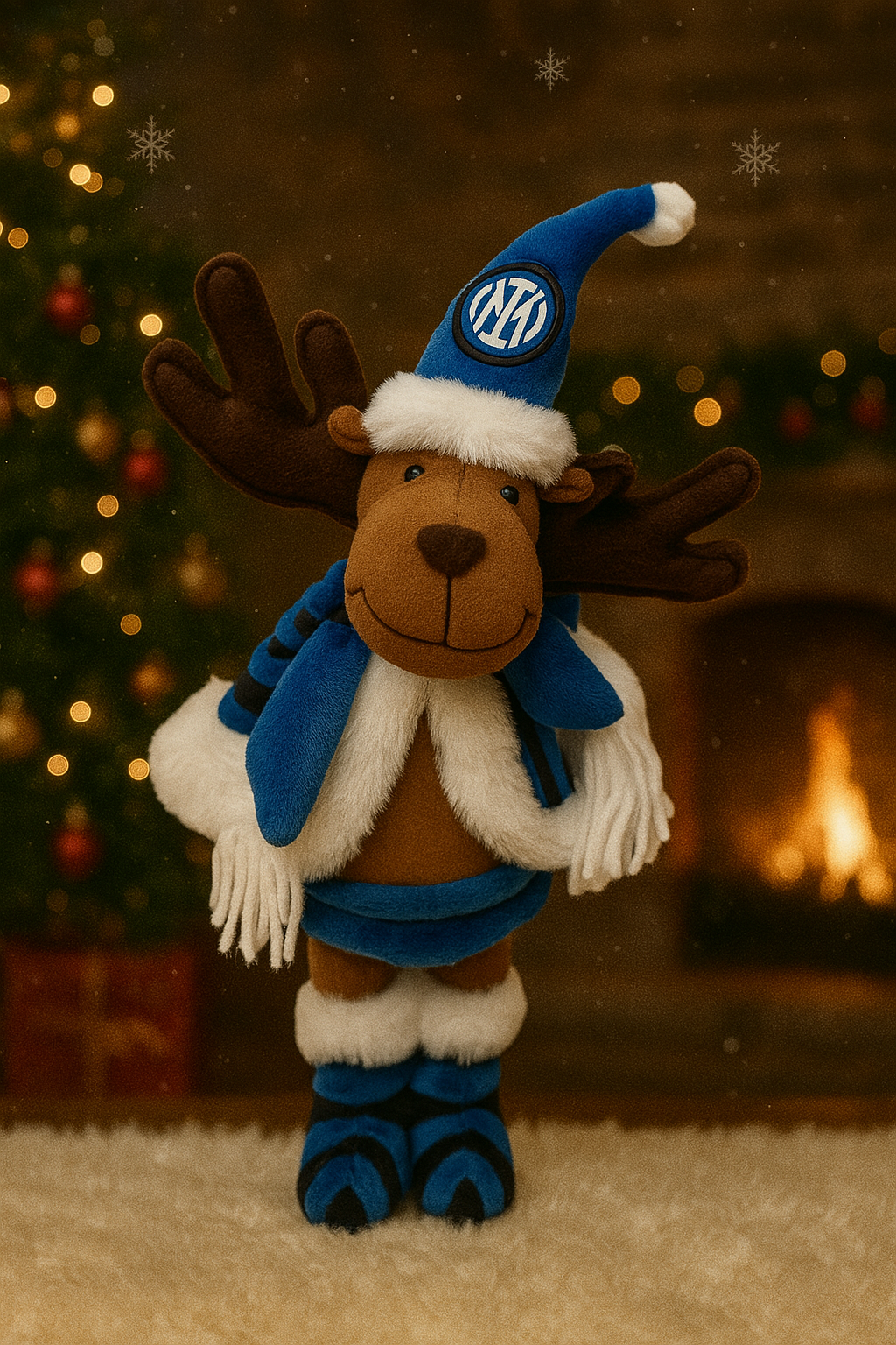 Realizzata con materiali morbidi e di alta qualità, la renna indossa un cappello nerazzurro con il logo FC Internazionale, una sciarpa coordinata e dettagli in pelliccia bianca sintetica che le donano un look festivo ed elegante. Le morbide corna marroni e il sorriso gentile completano l’atmosfera natalizia interista.
